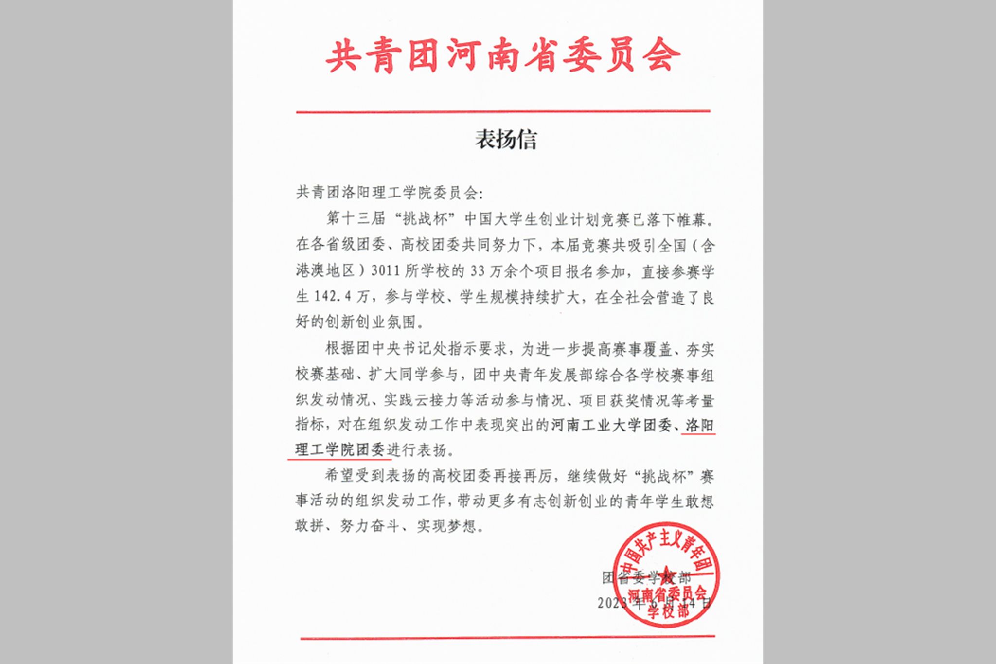 6月14日,因在第十三届“挑战杯”中国大学生创业计划竞赛中组织发动工作中表现突出,共青团河南省委受共青团中央委托,向美高梅娱乐场 团委发来表扬信。此次表扬是根据团中央书记处指示要求,团中央青年发展部综合各美高梅娱乐场 赛事组织发动情况、实践云接力等活动参与情况、项目获奖情况等考量指标确定,河南省仅两所高校获得表扬。