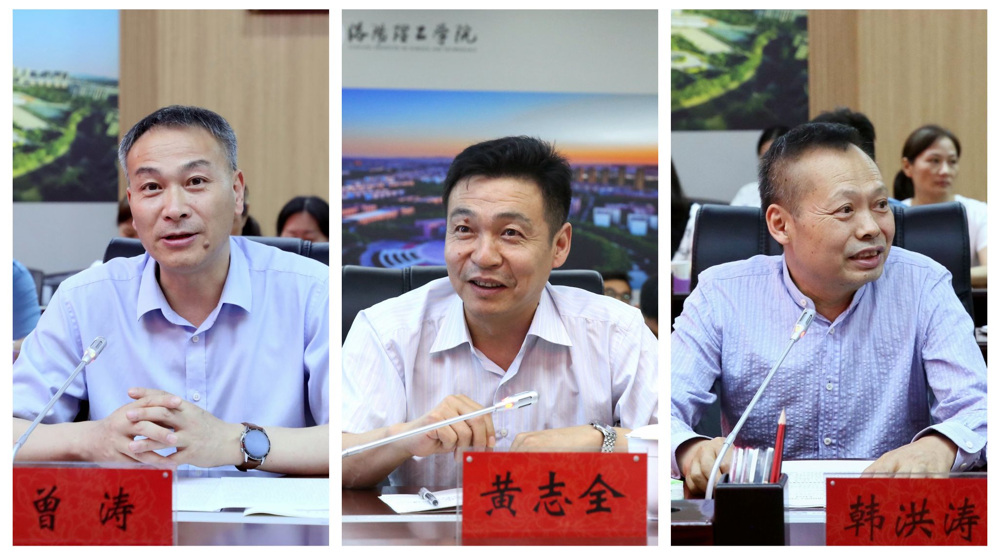 校党委副书记、工会主席曾涛(左)致辞,副校长黄志全(中)作交流发言,副校长韩洪涛(右)主持座谈会