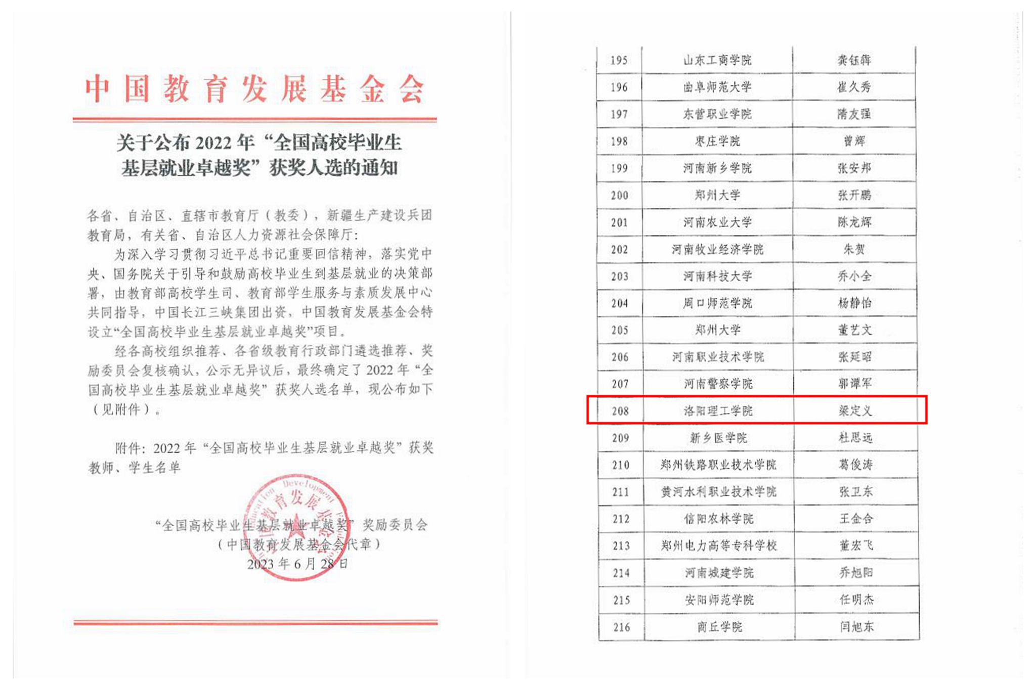 日前,中国教育发展基金会公布2022年“全国高校毕业生基层就业卓越奖”获奖名单,美高梅娱乐场 2014届材料成型及控制工程专业毕业生梁定义光荣入选,该奖项为首届设立,共评选出来自全国的398名高校毕业生。