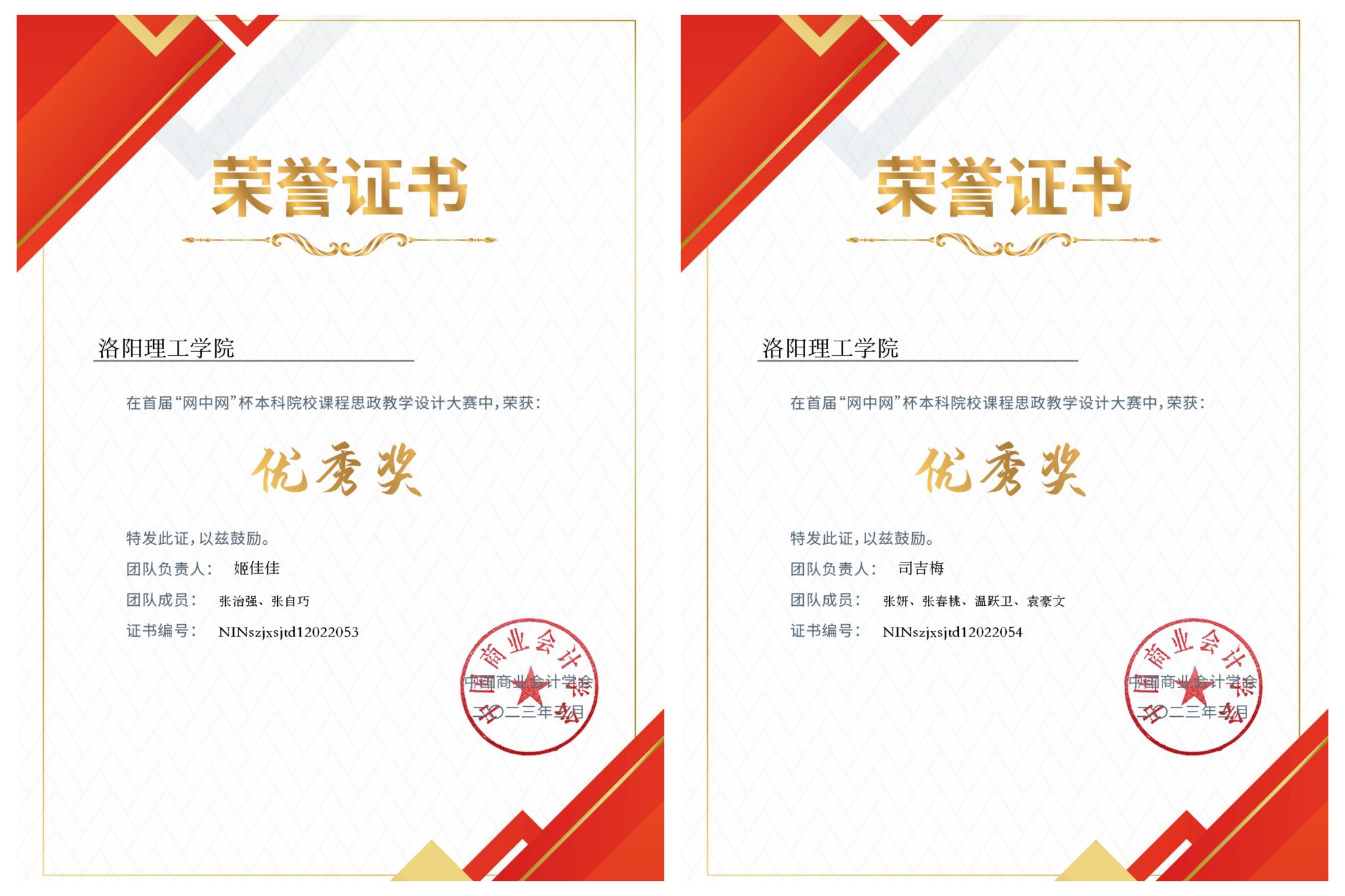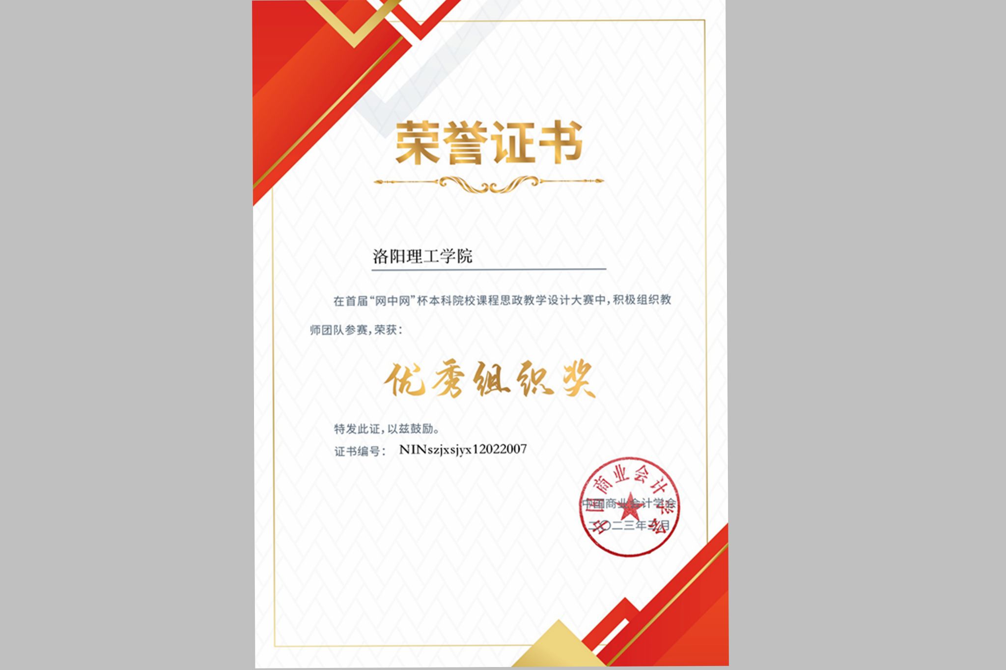 教师在全国首届“网中网”杯本科院校课程思政教学设计大赛中获佳绩,图为初赛优秀奖荣誉证书