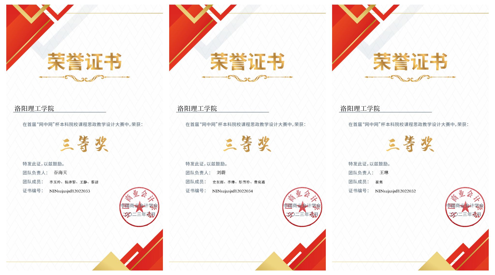 教师在全国首届“网中网”杯本科院校课程思政教学设计大赛中获佳绩,图为初赛三等奖荣誉证书