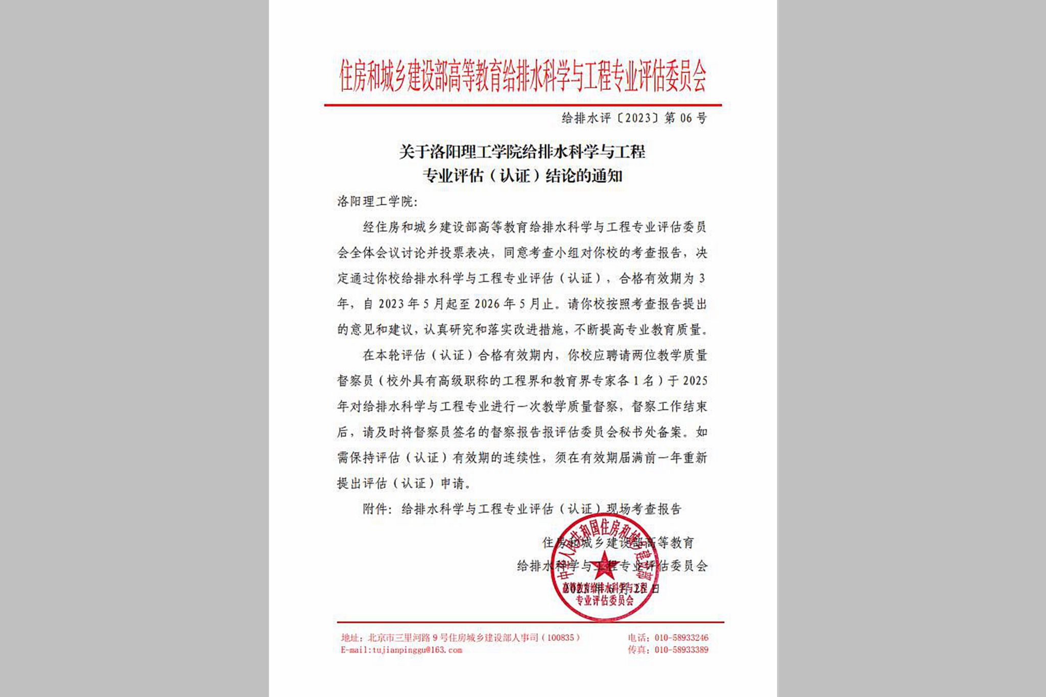 给排水科学与工程专业评估(认证),合格有效期为3年,自 2023年5月起至2026年5月止。