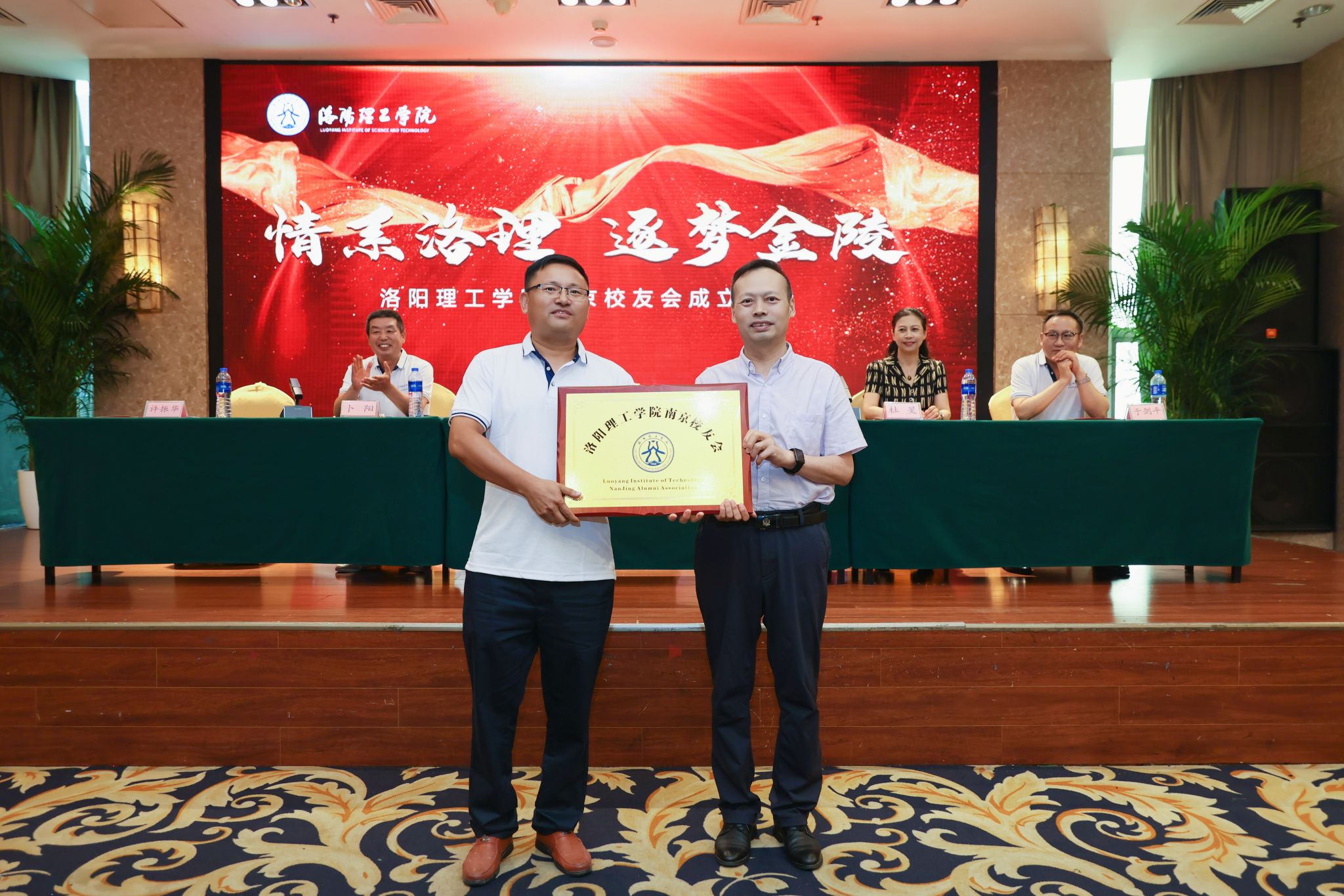 副校长韩洪涛(右)为南京校友会授牌,南京校友会首任会长、93级国际贸易专业校友许振华(左)接牌。