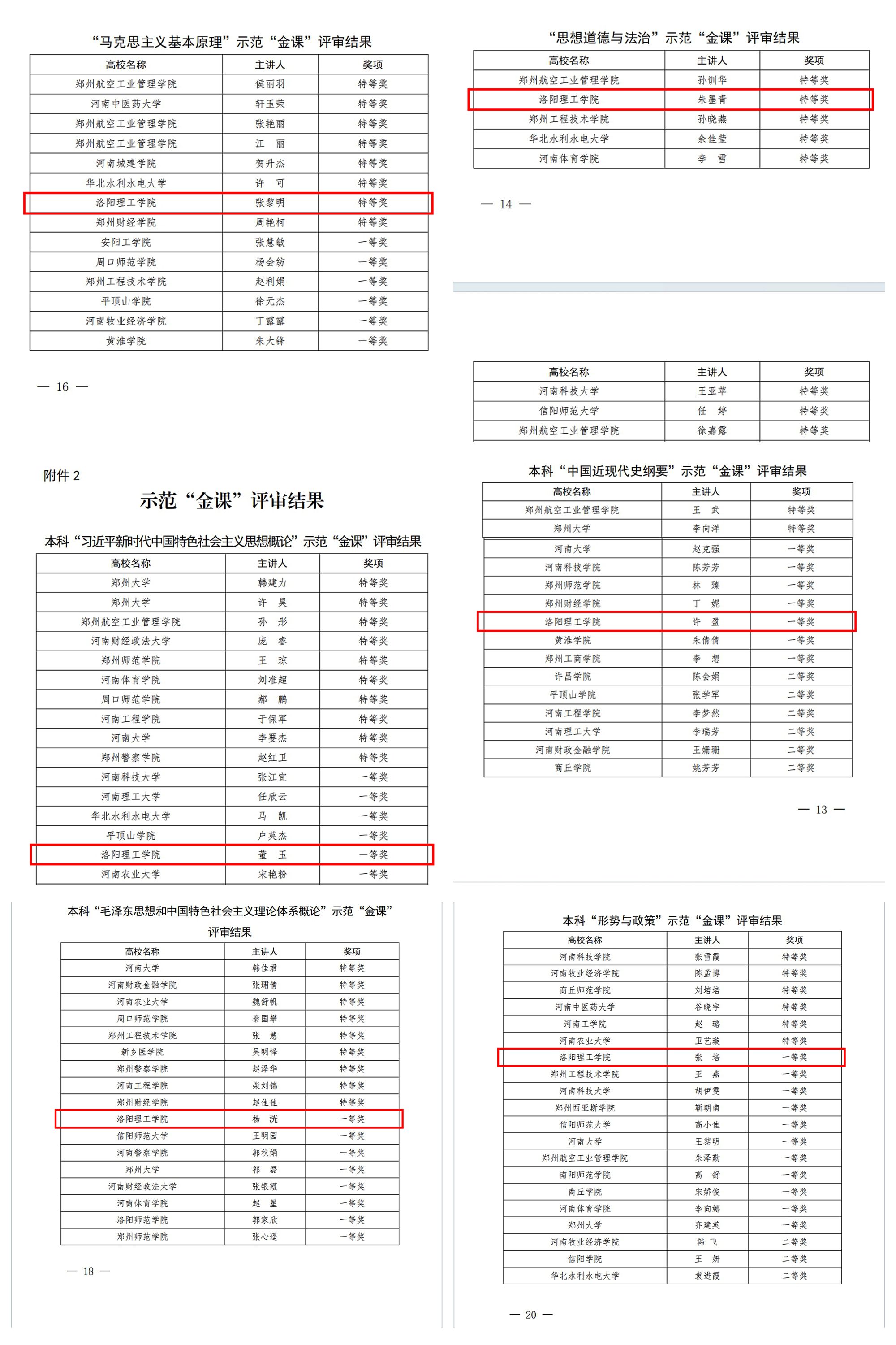 参加示范“金课”评审的6门思政课全部获奖,其中,张黎明荣获“马克思主义基本原理”特等奖、朱墨青荣获“思想道德与法治”特等奖,董玉、许盈、杨洸、张培分别荣获本科“习近平新时代中国特色社会主义思想概论”、本科“中国近现代史纲要”、本科“毛泽东思想和中国特色社会主义思想概论”、本科“形势与政策”一等奖。