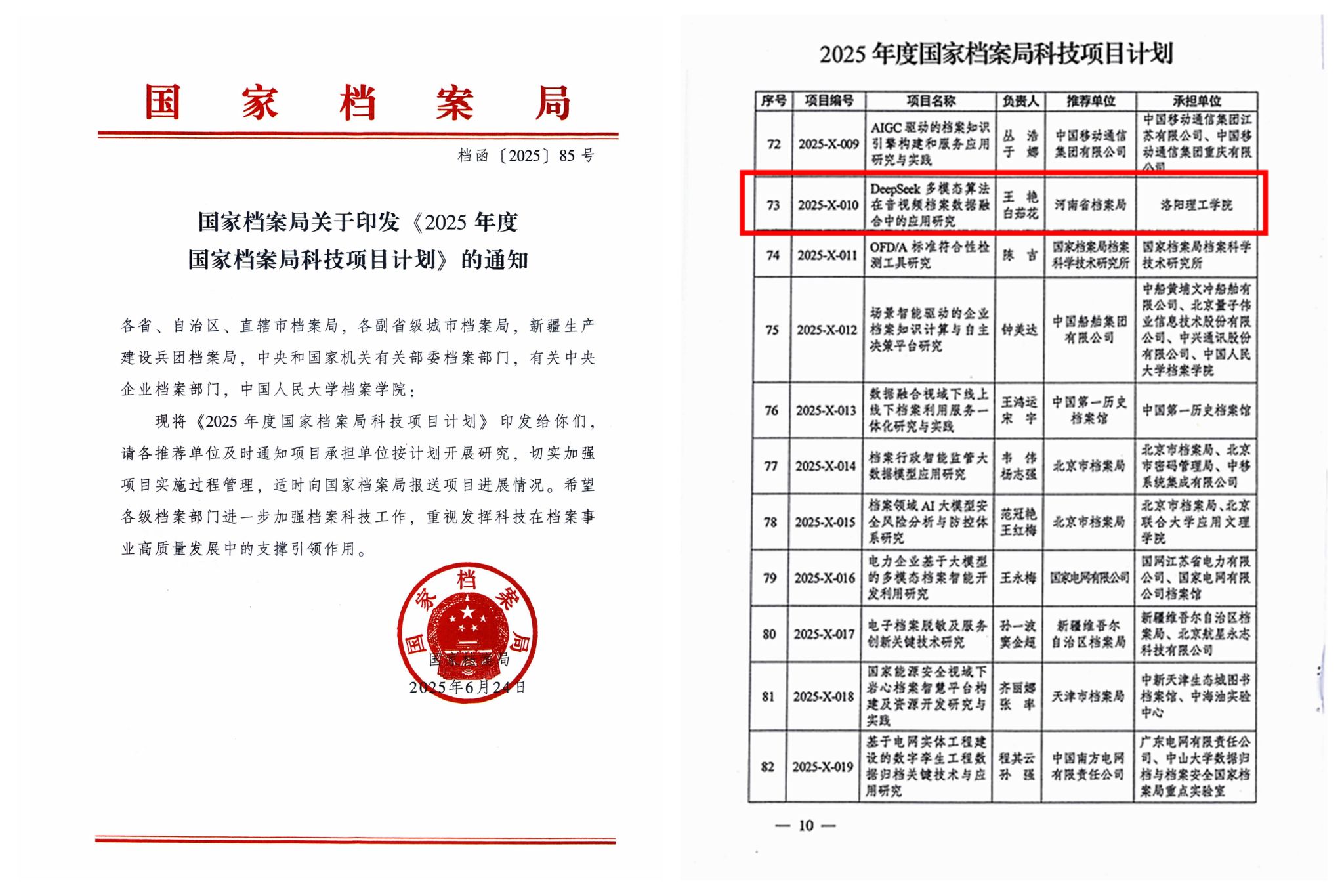 档案馆主持申报的课题“DeepSeek多模态算法在音视频档案数据融合中的应用研究”成功获批立项。该项目经河南省档案局专家评审推荐,并通过国家档案局严格审查、评议委员会评议及公示环节,成为2025年度河南省三个获批立项项目之一。这是美高梅娱乐场