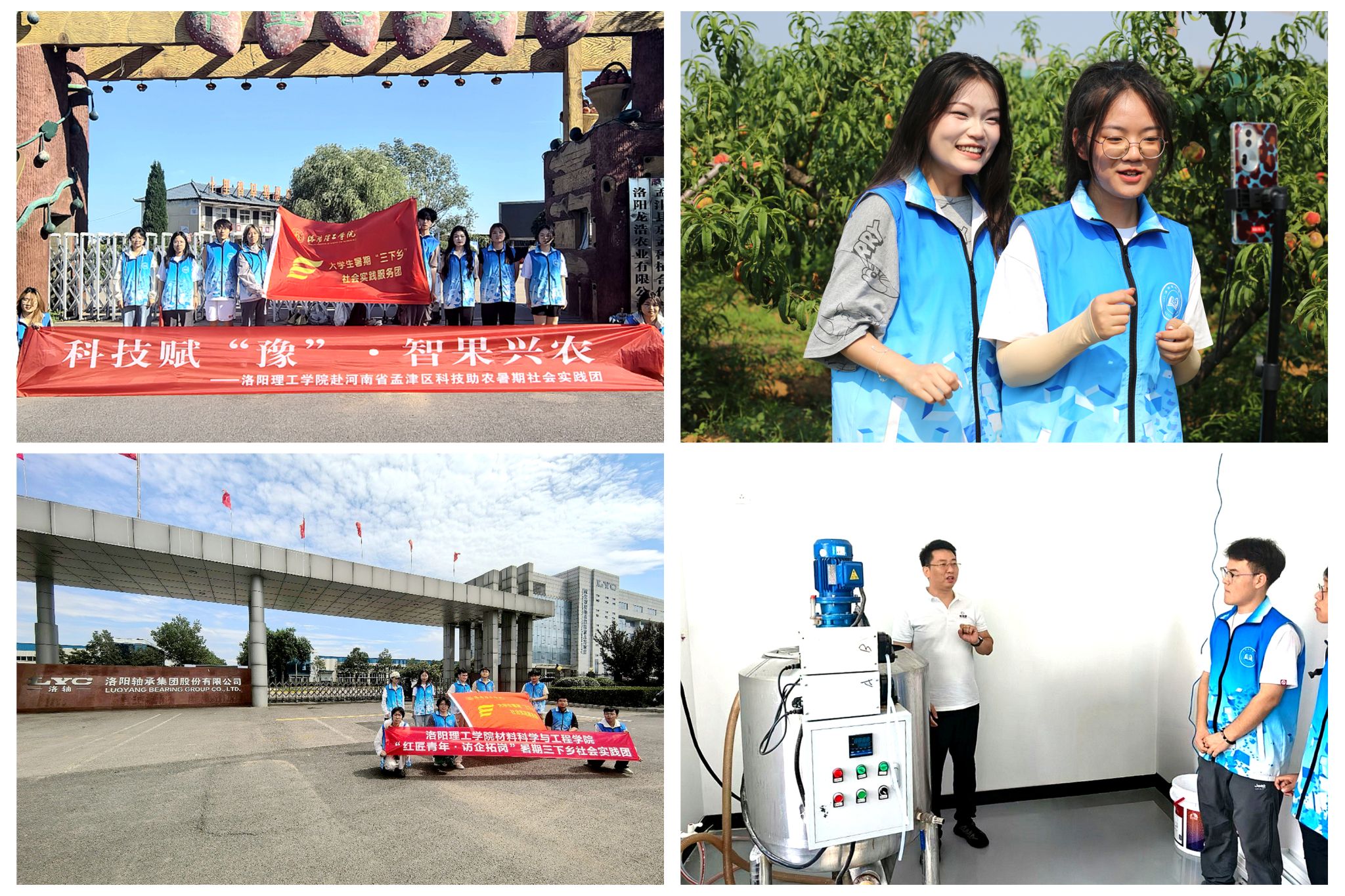 “科技赋豫,智果兴农”暑期社会实践团在孟津区“十里香”生态园开展助农直播与技术调研,探索科技兴农路径;“红匠青年·访企拓岗”暑期社会实践团则深入洛轴、鸿元轴承等四家企业,实地学习产业创新与人才需求。实践团成员走进企业车间和农业基地,开展技术服务和产业调研,将创新理念与专业实践相结合,在服务地方和企业发展的过程中提升了创新创业能力,展现青年以科技赋能产业进步的探索精神。