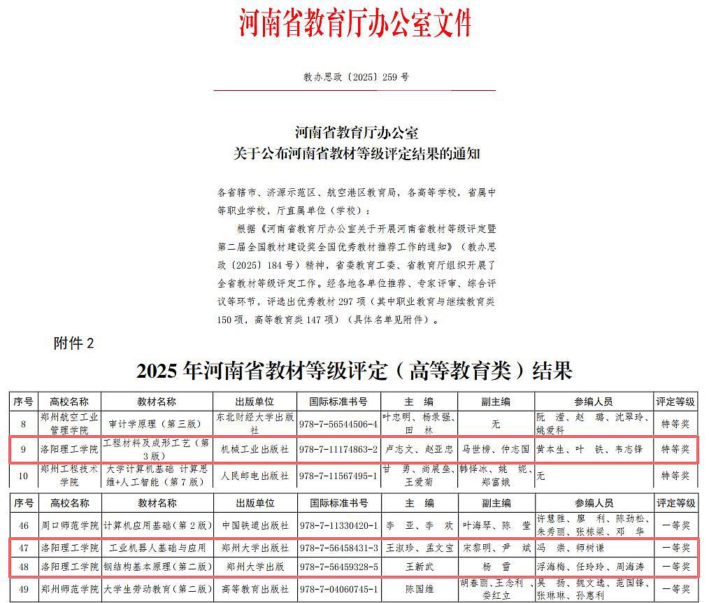 推荐申报的教材在此次评定中共获特等奖1项、一等奖2项,覆盖机械工程、土木工程、机器人工程等多个学科领域。