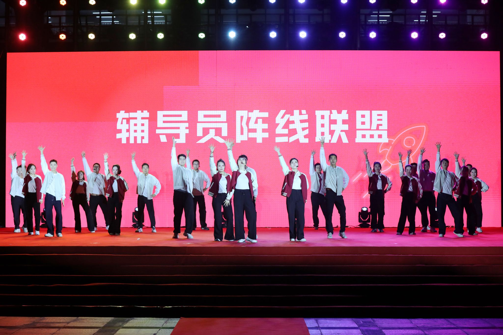 负责同志和2025级全体新生共同观看晚会。(图:仲昭麟 雷晨晨 张书瑜 石伊蕊 郭琳 李若玉 王子航 宋威翰 李艺凯 席清泉 刘泽达 孙怡璇 邢锺吉 井淑颖 韩超旭)