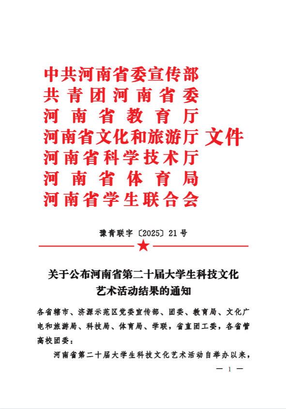 近日,由中共河南省委宣传部、共青团河南省委、河南省教育厅、河南省文化和旅游厅、河南省科学技术厅、河南省体育局及河南省学生联合会主办的河南省第二十届大学生科技文化艺术节公布比赛结果。美高梅娱乐场