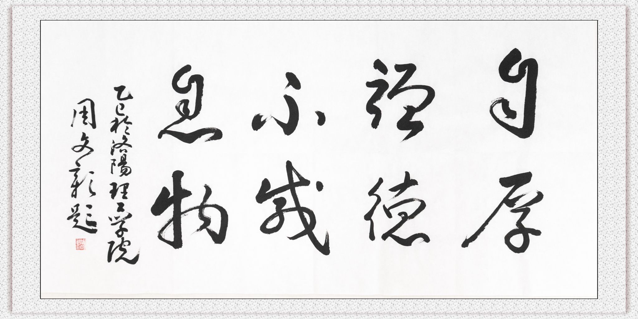 周文彰教授分别题写:“书以载道”“自强不息、厚德载物”“博览群书”“求真、惟实、开放、包容”。