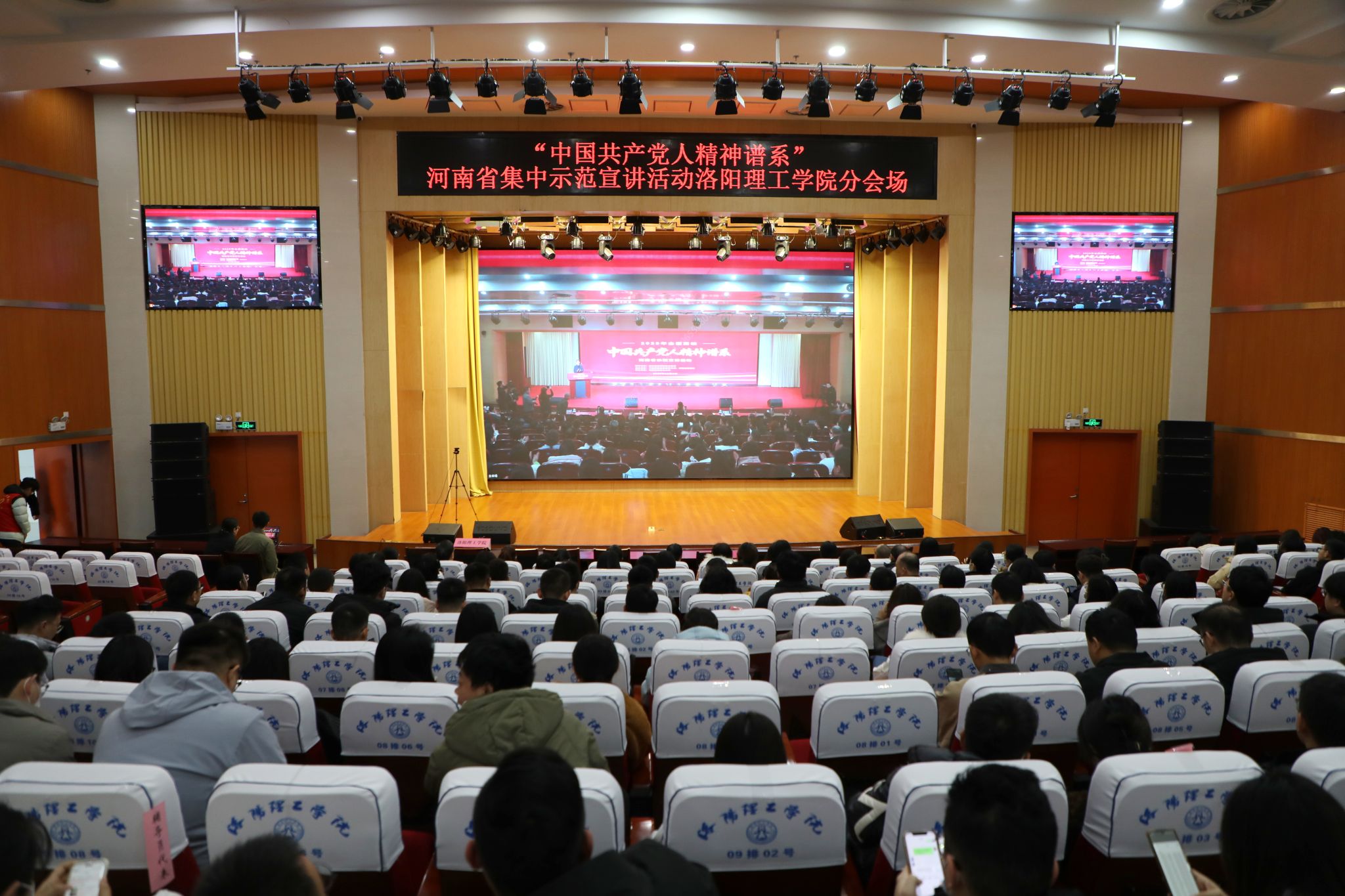 12月3日,省委教育工委、省教育厅主办的2025年全国高校“中国共产党人精神谱系”河南省集中示范宣讲活动举行。美高梅娱乐场 在王城校区图书信息中心报告厅通过腾讯会议设置分会场,马克思主义美高梅娱乐场 教师代表、辅导员代表和学生代表共400余人集中观看。