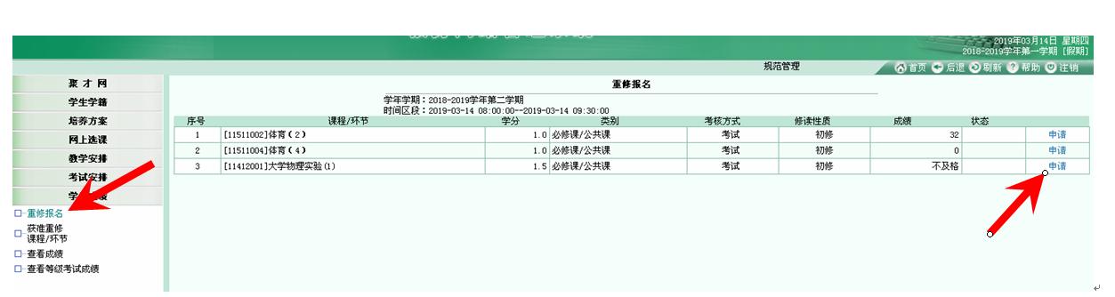(2)点击“学生成绩—重修报名”,在右侧窗口内的课程信息中,选择需要重修课程,点击“申请”即可。