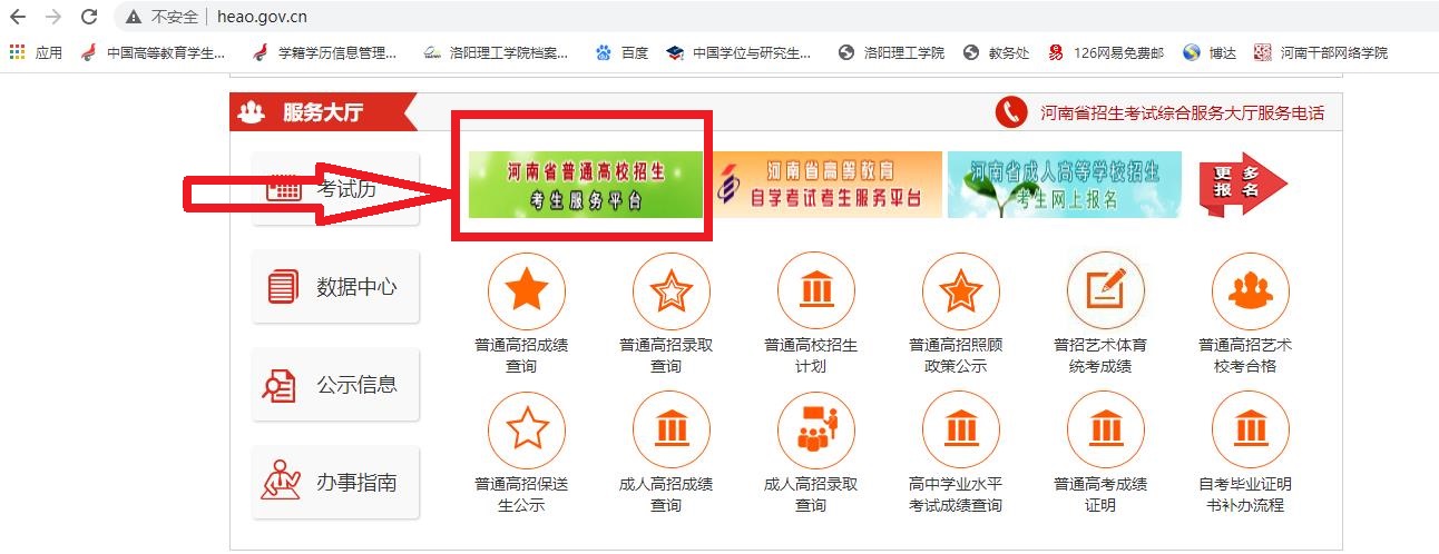 2.报名网址:河南省招生办公室网站(www.heao.gov.cn),点击网页上的“河南省普通高校招生考生服务平台”