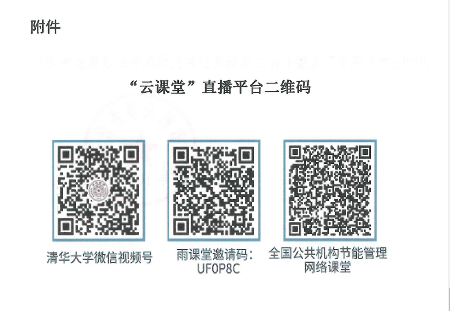 教职员工可扫描二维码,进入清华大学微信视频号、雨课堂、全国公共机构节能管理网络课堂参与“云课堂”活动,在线观看有关课程。