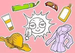 应当尽量选择轻薄、宽松及浅色的服装,佩戴宽檐遮阳帽及太阳镜。