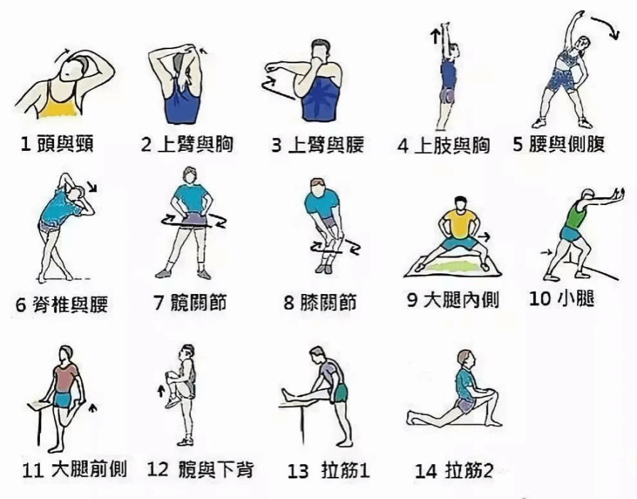 平时在运动前我们可以按照下图做一下热身康复训练,这样就可以有效预防运动相关的损伤,同时也可以对全身的肌肉进行康复,动起来吧。