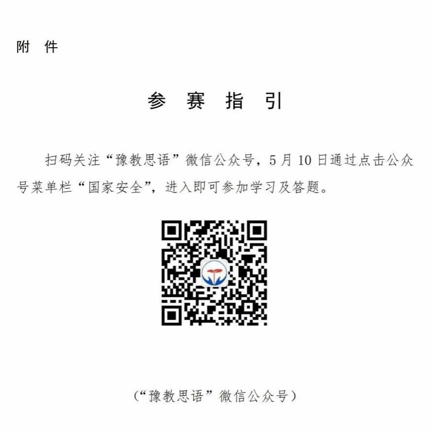 (一)学习准备。2023年5月10日—5月16日,全体在校学生关注“豫教思语”微信公众号,点击菜单栏“国家安全”,根据网页提示自行学习《国家安全知识竞赛参考题库》。