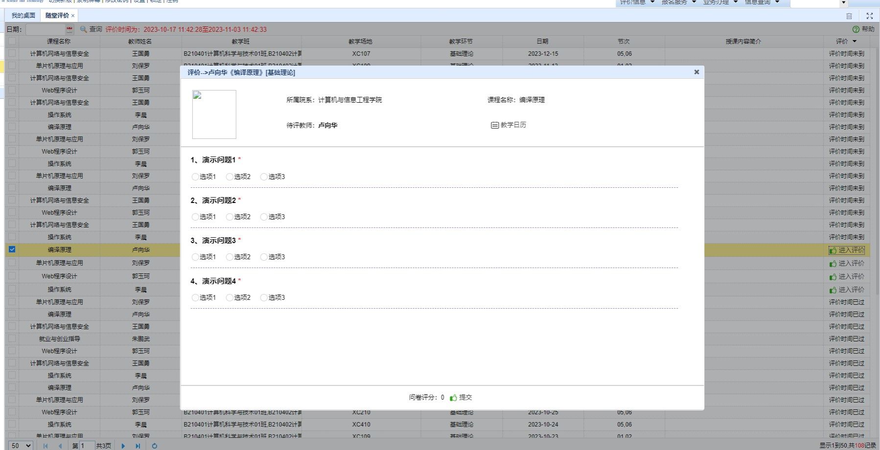 ②根据实际情况选择评价选项,完毕后点击最下方提交按钮,对每位教师最少评价一次。如下图: