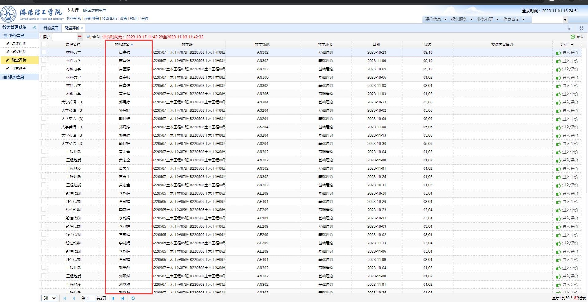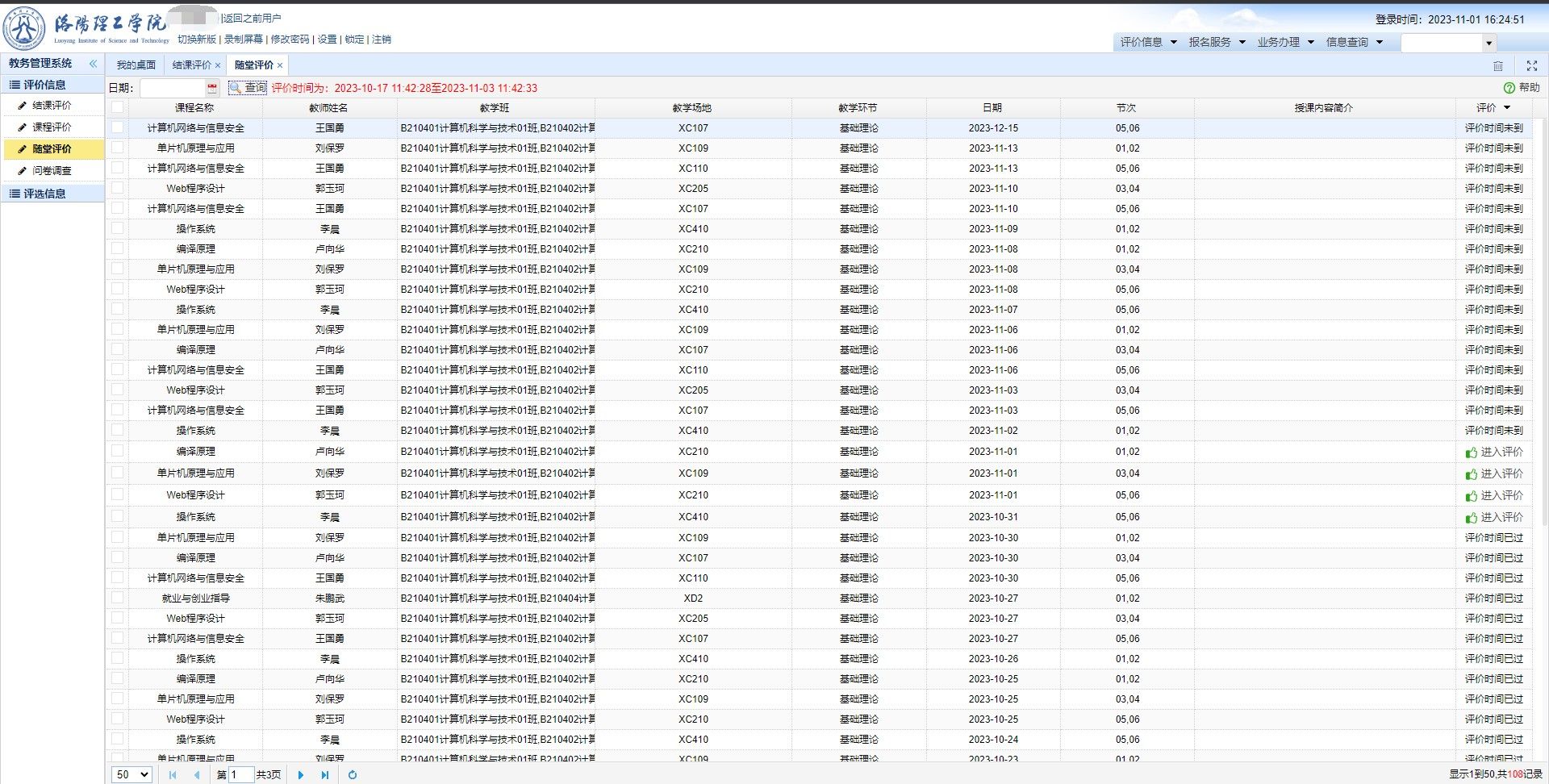 ①规定时间内,点击课程教师后边进入评价按钮,弹出随堂评价表功能界面(可按照上课日期查询课表)。如下图: