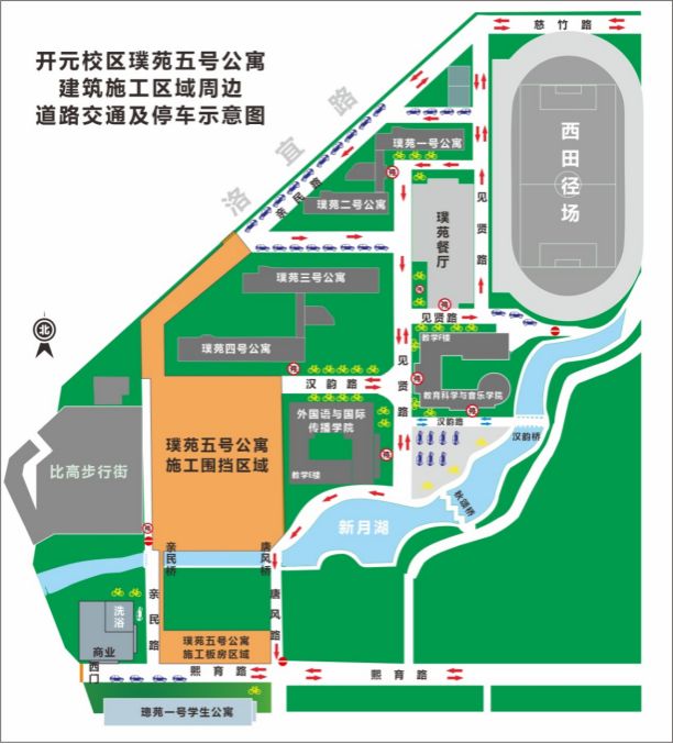 因开元校区璞苑5号学生公寓施工需要,为确保校园交通秩序及师生通行安全,现对相关区域道路交通进行调整。具体调整方案如下: