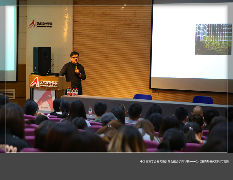 孙华锋老师的讲座由设计的思念、设计的思想和梦想改造家两部分内容组成。他凭借多年的教学经验和丰富阅历,把自己的设计经验分享给同学们,为学生们讲解了许多学习上的案例以及专业方面的规划。他对当前业界普遍存在的问题提出自己的见解,他说设计师要成为杂家,内心的思考很重要。他还就业界的未来发展给学生提出设计忠告,为学生今后的职业发展指明了方向。