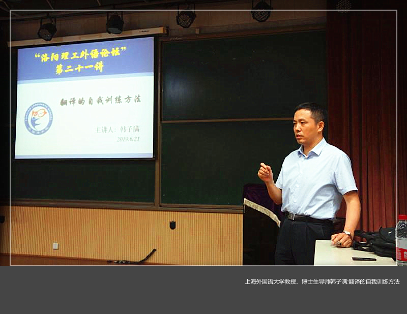6月21日,上海外国语大学教授、博士生导师韩子满应邀赴美高梅娱乐场 参加第二十一期“洛阳理工外语论坛”,为外国语美高梅娱乐场 师生作了题为“翻译的自我训练方法”的报告。