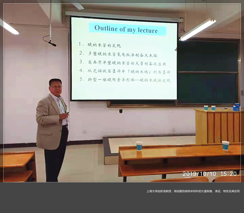 赵新洛教授首先介绍了上海大学物理系的基本情况,然后详细、系统地讲解了课题组在碳纳米管、碳纳米线、碳纳米墙等纳米材料的制备、结构表征、物性及其应用等方面的研究工作。其中重点介绍了以铁为催化剂,用氢-氩电弧放电法大量生产高纯度、高结晶性单壁碳纳米管的方法,并首次用高分辨透射电子显微镜和拉曼光谱技术确定了碳纳米线(Carbon nanowire)的存在。赵教授的报告深入浅出、循序渐进,其严谨治学、一丝不苟的学术态度赢得了师生们的广泛好评。材料美高梅娱乐场