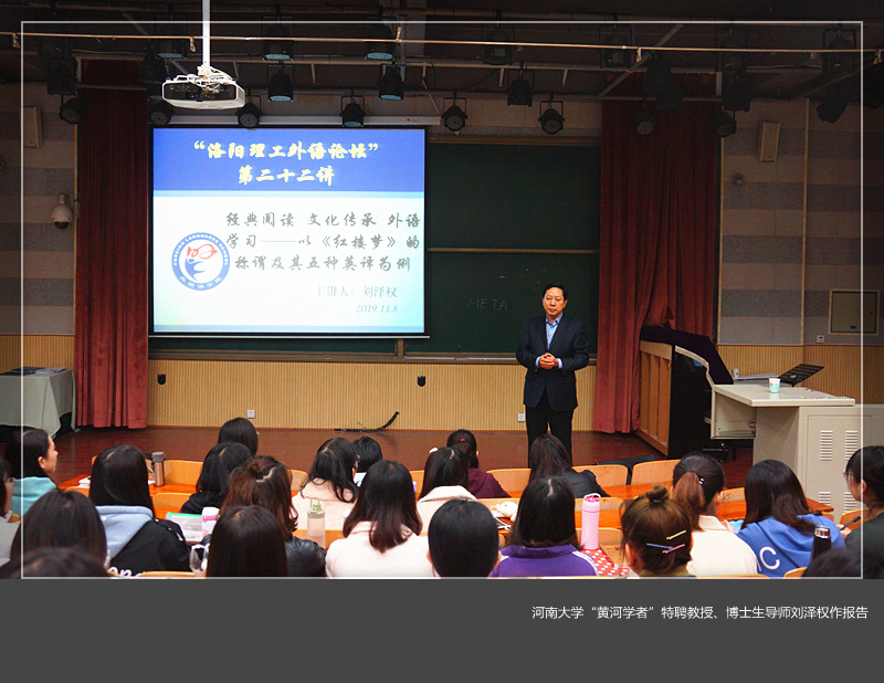 刘泽权教授首先概括总结了多位名家对中国经典文学作品《红楼梦》的不同评述,然后分析了《红楼梦》中称谓的五种英译版本,通过语言的定量分析让师生们直观感受到译文的不同特点。他还用同样的方法评析了海明威《老人与海》的几个中译版本,用大量的实例证明了科学统计方法在经典阅读与学术研究中的重要作用。刘教授强调通过经典阅读进行优秀文化传承的重要意义,以及通过经典阅读进行外语学习与人文素养提升的必要性。
