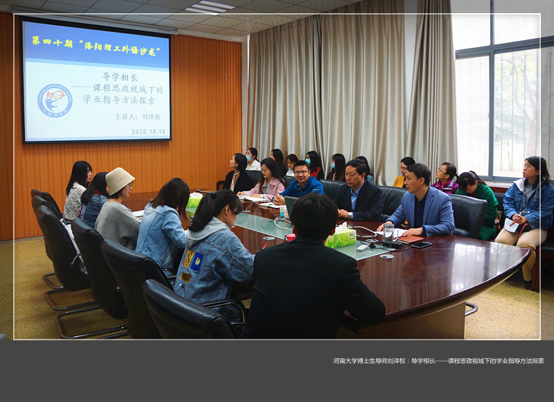 政治理论课教师座谈会的讲话,他指出在“后疫情”时代,如何将西方文化知识与我国文化相结合,培养具有爱国情怀、有文化自信、会讲中国故事的新时代建设者和接班人,这对于外语教师来说,既有挑战,又有优势。随后,刘教授又从“我是谁”、“我可以为学生做什么”以及“我做了什么”这三方面与师生分享了他多年的学业指导经验。他认为,要通过座谈、反馈等形式对学生进行有效引导,针对学生的特点因人而教,因材施教;要与学生一起学习,一同成长,将思政元素融入到课程目标设计、教学大纲修订、教材编审选用、教案课件编写等各方面,贯穿于课堂授课、教学研讨、实习实训、作业论文等各环节。