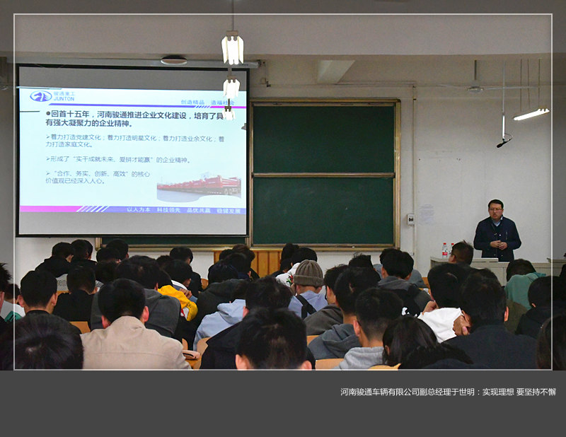 于世明高级工程师首先介绍了河南骏通车辆有限公司的基本情况,然后详细、系统地讲解了特种车辆的市场前景、先进制造技术。就通过自动化控制进行精密部件的装配,自动化焊接机器人在车辆加工行业的应用等技术领域进行了分析。并针对大学生的个人目标制定、理想的实现等方面进行了指导。强调每位大学生都应该为了实现理想而坚持不懈、努力奋斗,指出每一份收获,都是坚持不懈的努力;每一份汗水,都是走向成功的积累。于世明高级工程师的报告深入浅出,科学生动,让聆听报告的师生受益匪浅。