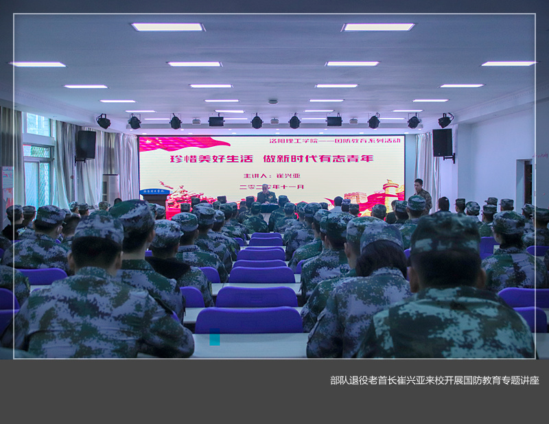11月12日下午,校武装部邀请退役老首长崔兴亚以“珍惜美好生活,做新时代有志青年”为题,开展国防教育专题讲座。洛龙区人武部部长智建国、河南省军区洛阳第五干休所参谋贾志彬等一行6人,以及校武装部工作人员和青年先锋营和学生代表参加了此次活动。