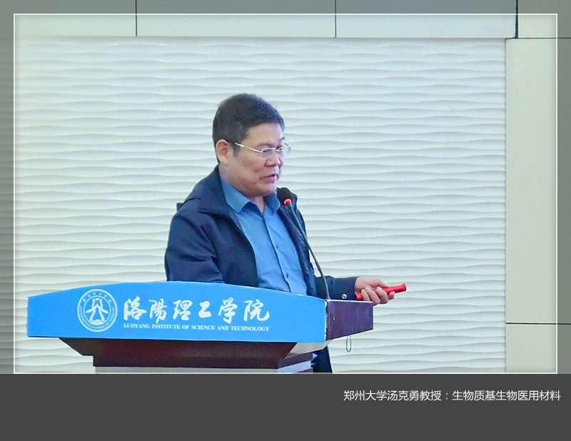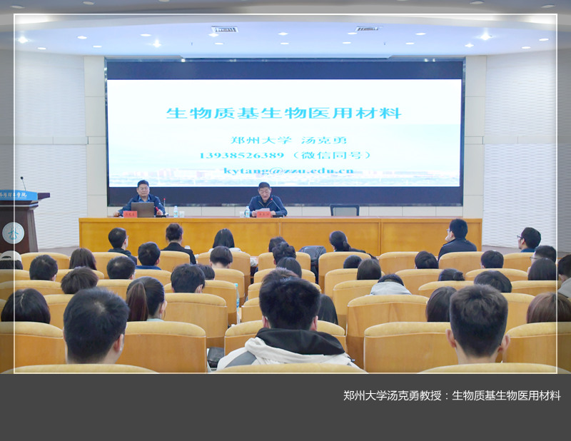 、河南省生物质资源与材料国际联合实验室的概况,然后概述了近年来天然高分子生物医用材料领域的研究成果。在本次报告中,汤教授以生物质基生物医用材料研究进展为主题,讲解了胶原、纤维素等生物质资源的结构与性能,说明了胶原作为医用材料的优点,如来源丰富、可生物降解、无毒、可塑性强等;并从分子尺度到宏观尺度、自组装及聚集体的角度,介绍了胶原基生物医用新材料设计与构建的方法,以及团队的相关研究成果,如更高效的止血海绵、更优良的骨组织修复支架等医用材料;最后对胶原基生物医学材料研发的发展趋势进行了展望。
