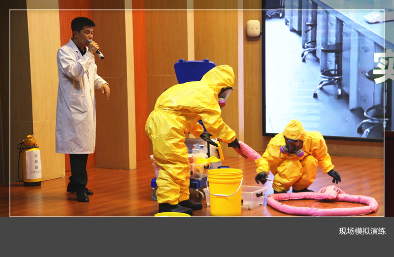 师生以情景剧形式演示了危险化学品泄露事故应急演处置全过程。在应急演练中,参演师生生动模拟了浓硫酸泄漏后,人员的有序撤离、现场封锁、事故危害评估、事故有序上报、应急救援人员的个人防护、消除危险源、现场恢复、事故发生后的调查与评估等规范化应急处置流程。