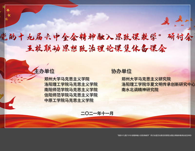 思想政治理论课改革创新的若干意见》文件要求,11月27日,“党的十九届六中全会精神融入思政课教学”研讨会暨五校联动思想政治理论课集体备课会成功举办。
