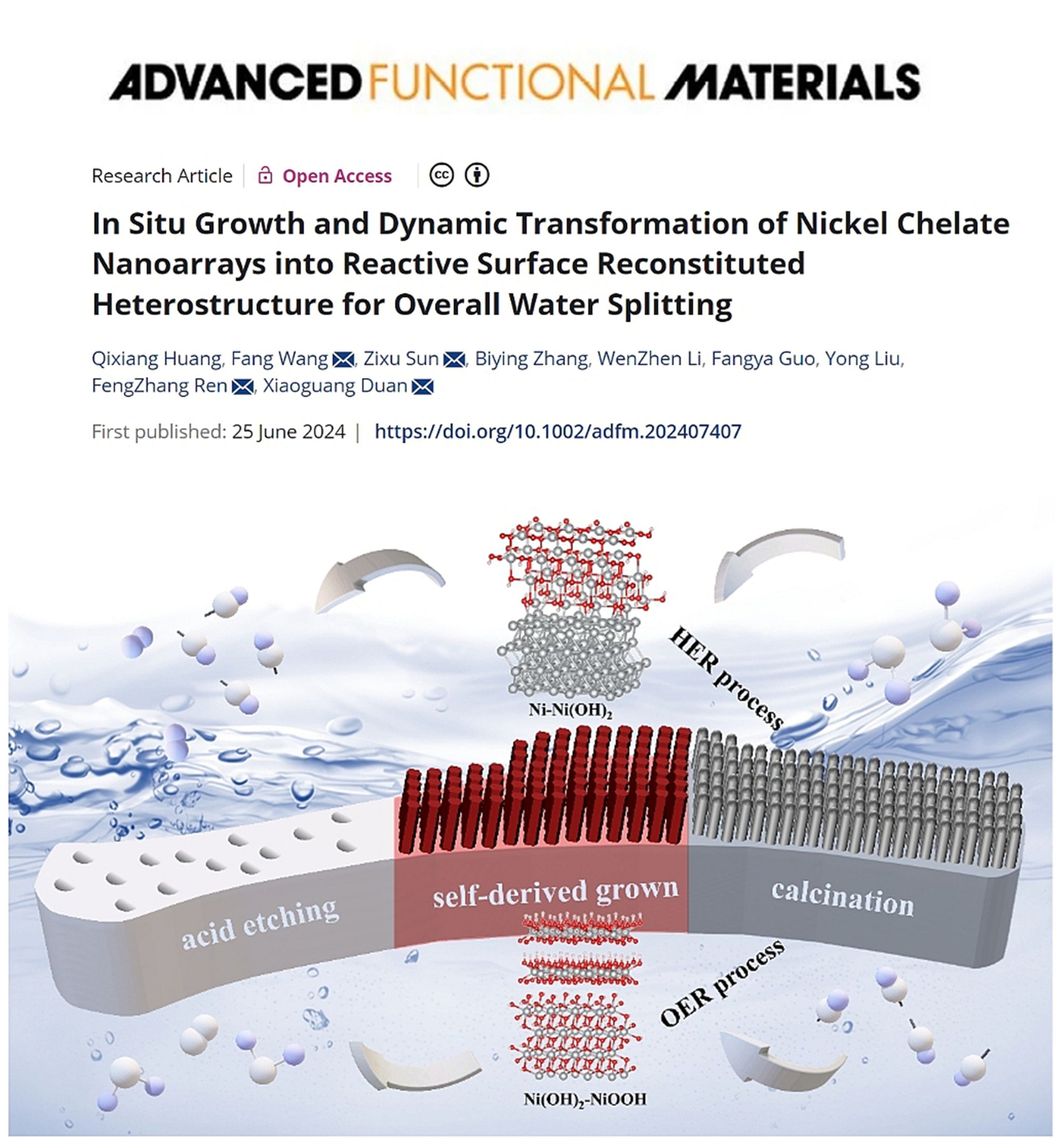 王芳教授在国际材料科学领域顶级期刊《Advanced Functional Materials》(《先进功能材料》)发表题为“In-situ growth and dynamic transformation of Nickel chelate nanoarrays into reactive surface reconstituted heterostructure for overall water splitting”的研究论文。美高梅娱乐场