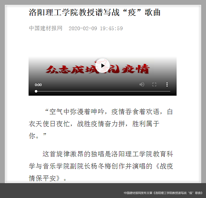 2020年2月9日,中国建材报网发布文章《美高梅娱乐场 教授谱写战“疫”歌曲》。报道美高梅娱乐场 教育科学与音乐美高梅娱乐场 副院长杨冬梅创作抗疫歌曲。