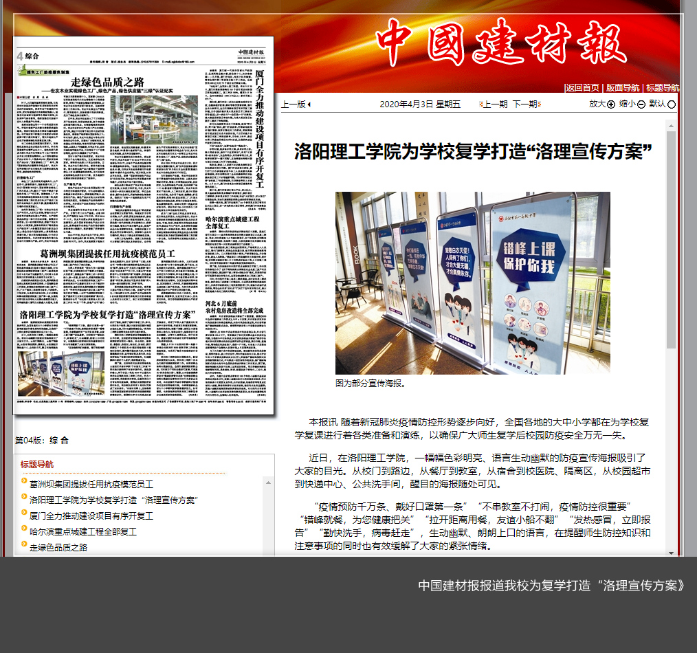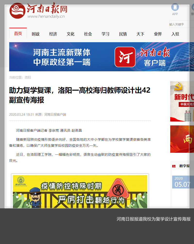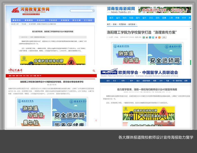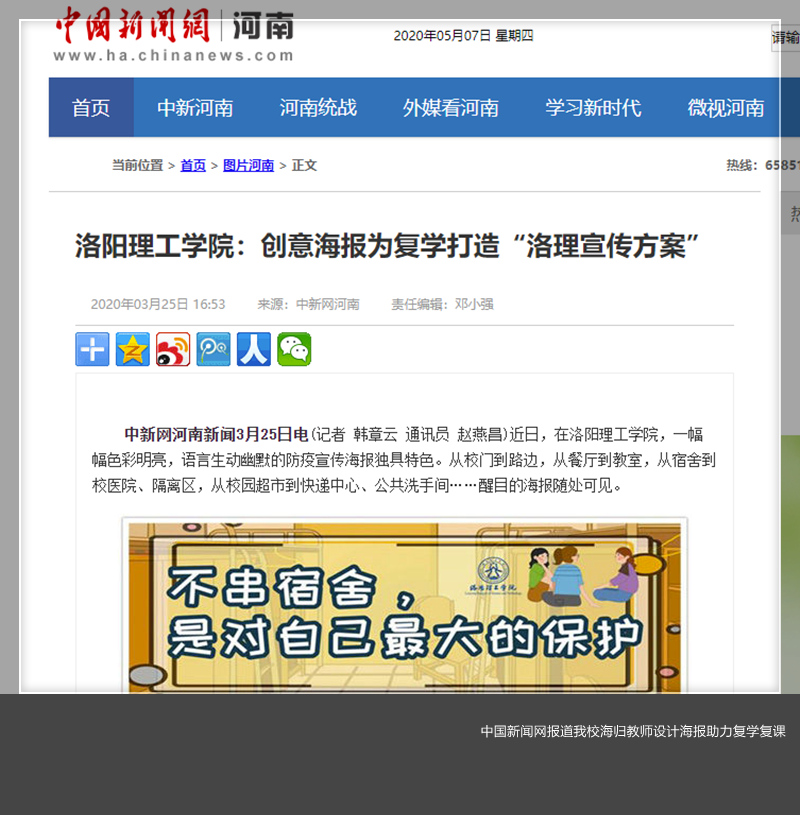 3月24日,河南日报客户端、洛阳宣传以《助力复学复课,洛阳一高校海归教师设计出42副宣传海报》为题对美高梅娱乐场 艺术设计美高梅娱乐场 青年海归教师宋子言设计42幅防疫宣传海报助力复学复课的事迹予以专题报道。3月25日,中新网以《美高梅娱乐场 :创意海报为复学打造“洛理宣传方案”》为题予以专题报道,中国建材报以《美高梅娱乐场 为美高梅娱乐场 复学打造“洛理宣传方案”》为题报道,大河网以《制作生动的防疫宣传海报 美高梅娱乐场 为美高梅娱乐场 复学打造“洛理宣传方案”》为题报道,河南教育宣传网以《助力复学复课,美高梅娱乐场 教师设计出42幅宣传海报》为题报道。河南高教以《助力复学复课,这所高校教师设计出42副宣传海报》为题报道。
