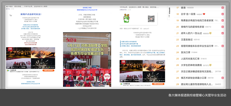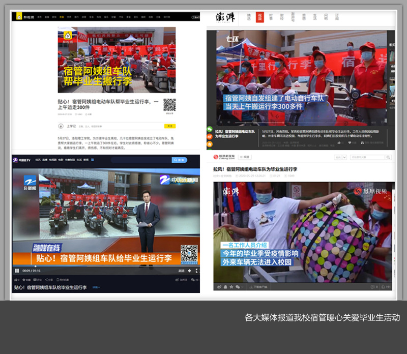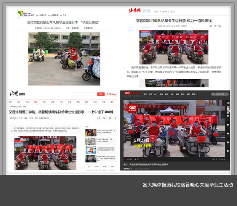 5月27日,美高梅娱乐场 专科毕业生返校复学期间,后勤管理处物业服务公司的宿管阿姨们自发组织车队帮助毕业生送行李,该暖心行为被全国各大媒体予以报道。人民日报官方微博以《排面,高校宿管阿姨组车队给毕业生搬行李》为题报道;新华社、共青团中央、中国青年报、河南省教育厅等官方微信以《今年毕业季,这些高校令人羡慕!篝火晚会、烟花祝福……》为题予以专题报道;梨视频、澎湃新闻、南方都市报、中国青年网、北京时间、安徽卫视、浙江卫视中国蓝新闻、凤凰视频、北晚新视觉、头条新闻、环球网等各大媒体纷纷以不同形式在各类平台推出专题报道。相关话题一度登上微博平台热搜榜单。