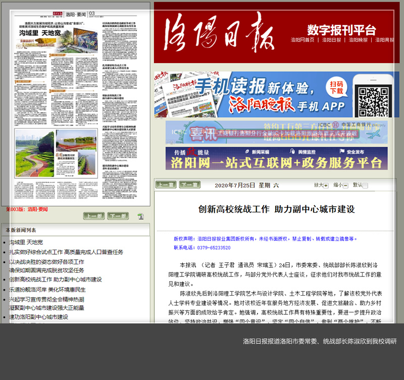 7月25日出版的洛阳日报以《创新高校统战工作,助力副中心城市建设》为题报道了洛阳市市委常委、统战部部长陈淑欣到美高梅娱乐场 调研统战工作。洛阳网同步报道