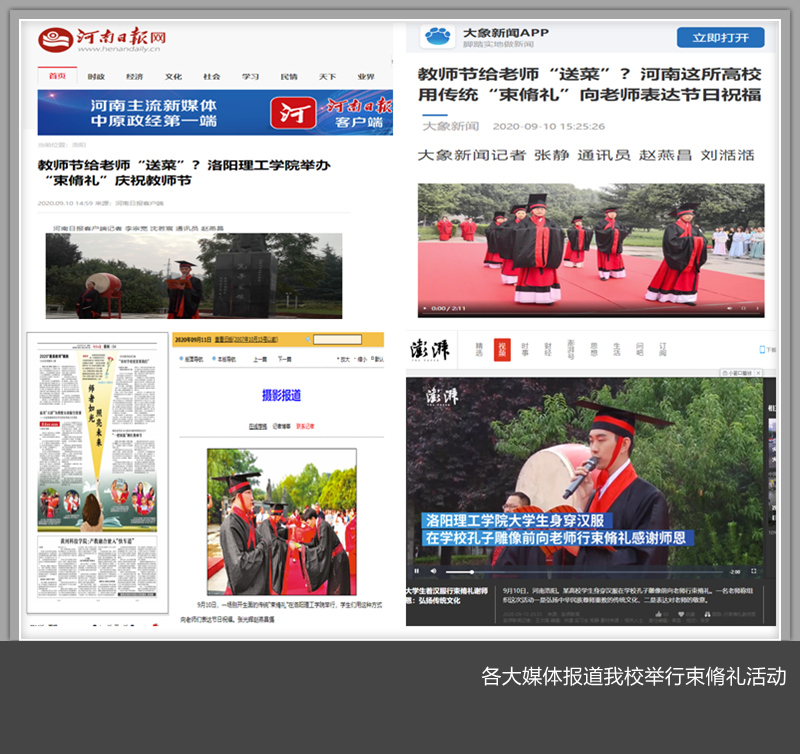 9月10日,河南日报网、河南日报客户端以《教师节给老师“送菜”?美高梅娱乐场 举办“束脩礼”庆祝教师节》刊发报道;大象新闻、大象网以《教师节给老师“送菜”?河南这所高校用传统“束脩礼”向老师表达节日祝福》为题报道;中国新闻网、光明网以《河南一高校再现“束脩礼”倡导尊师重教》刊发报道;新华网以《高校学生着汉服为老师送肉干 用仪式感表达对老师的敬意》。