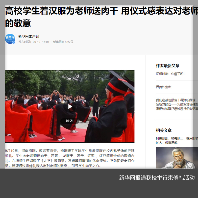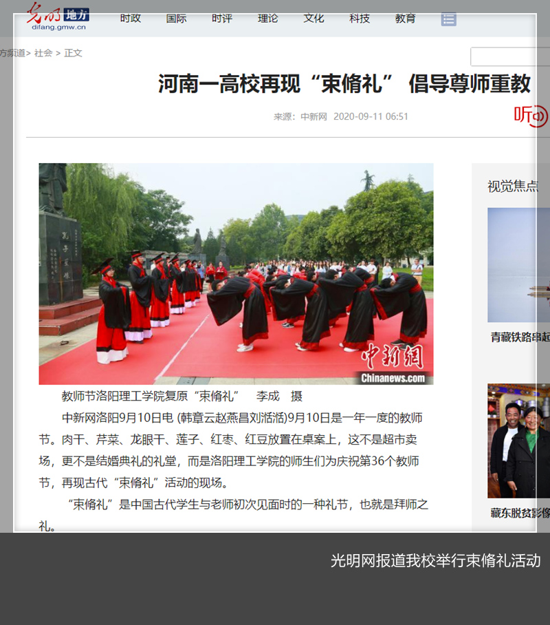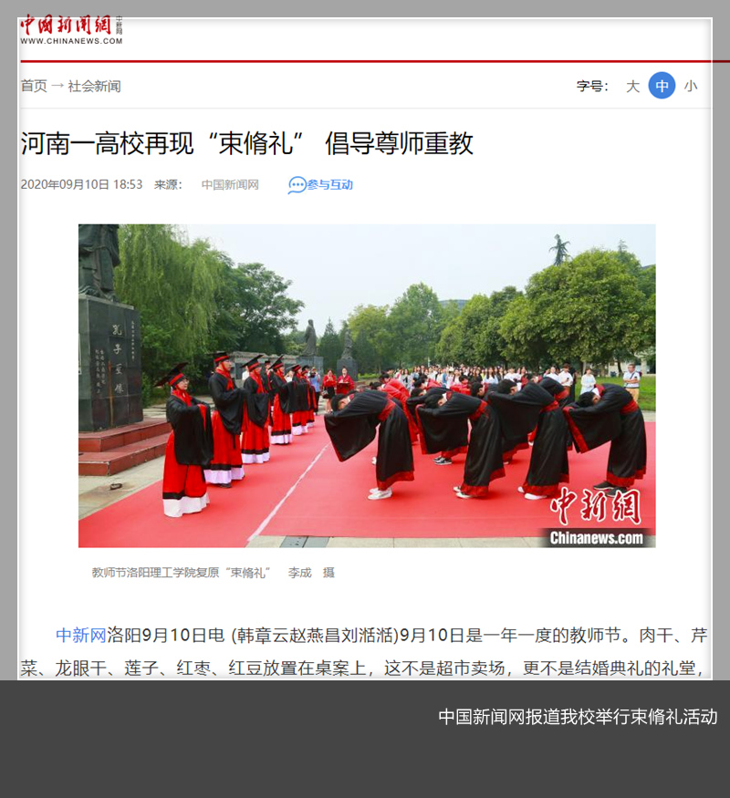 2020年9月10日教师节期间,美高梅娱乐场 组织教师学生举行传统“束脩礼”活动庆祝第36个教师节。活动被中国新闻网、光明网、大象新闻、河南日报、洛阳晚报登媒体报道。