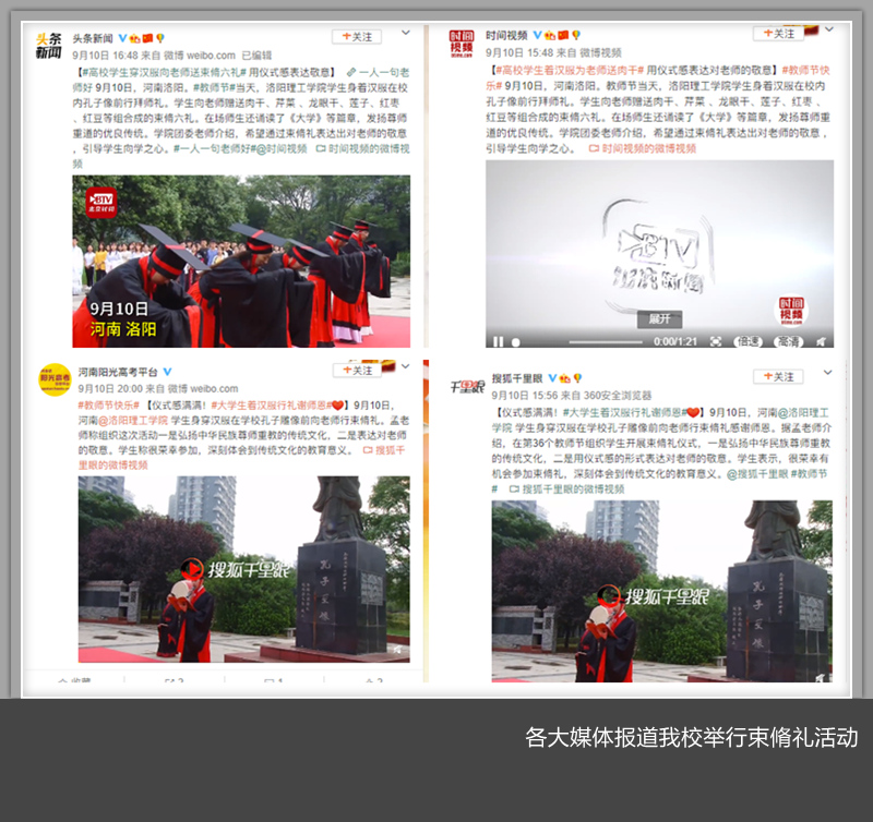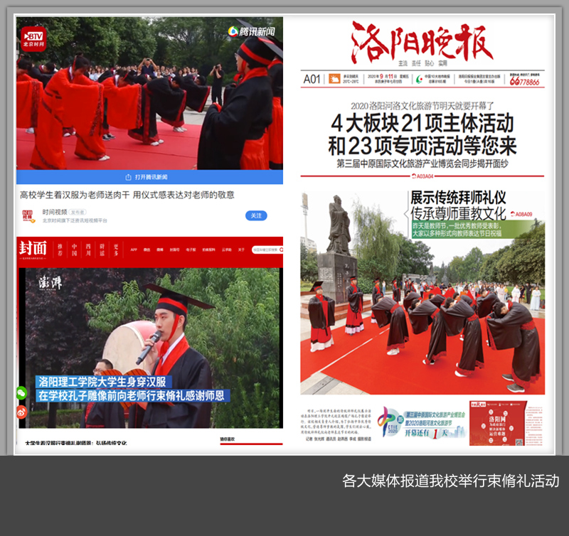 9月11日洛阳晚报头版刊发整版报道《展示传统拜师礼仪 传承尊师重教文化》;洛阳广播电视台发布视频新闻;9月13日,学习强国平台《河南洛阳:学子行束脩礼致敬老师》为题报道。