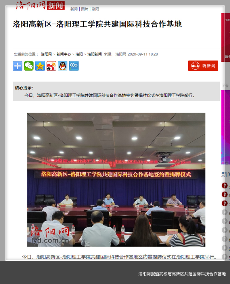 9月11日,洛阳网以《洛阳高新区-美高梅娱乐场 共建国际科技合作基地》为题报道美高梅娱乐场 携手高新区共建国际科技合作基地。