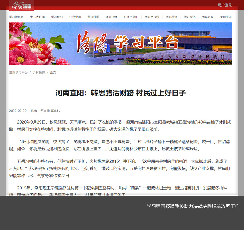 9月30日,中共河南省委组织部和河南日报集团联合主办的《河南驻村》微信平台以《宜阳五岳沟村:特色种养带动群众脱贫致富》为题,学习强国洛阳平台以《河南宜阳:转思路活财路 村民过上好日子》为题进行转载报道。