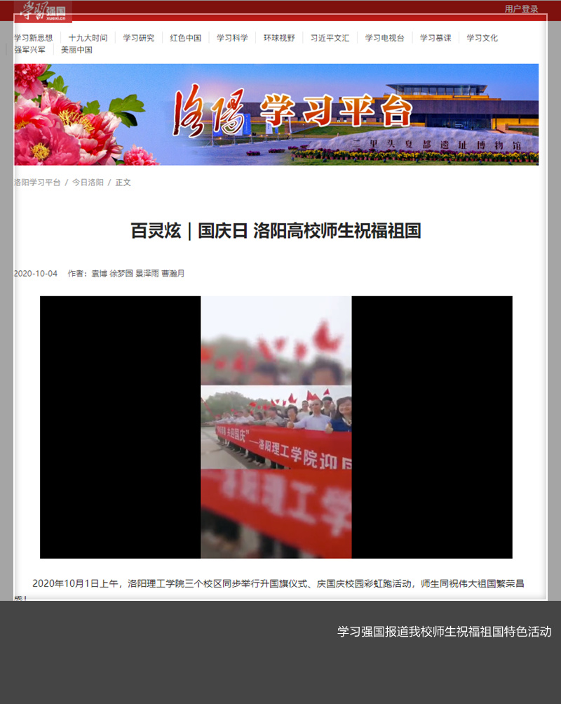 10月4日,学习强国洛阳平台以《百灵炫|国庆日 洛阳高校师生祝福祖国》为题报道美高梅娱乐场 师生国庆日祝福祖国特色活动。