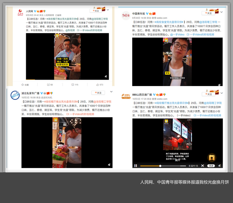 9月29日,人民网法人微博以【口味任选!河南一#高校餐厅推出凭光盘领月饼#】为话题报道了美高梅娱乐场 餐厅推出“光盘”领月饼活动。中国青年报、语文阅刊、山西交通广播、湖北私家车广播等媒体先后予以报道。梨视频官网以《高校餐厅送千个月饼学生凭光盘领取,4种口味任选》发布视频报道。