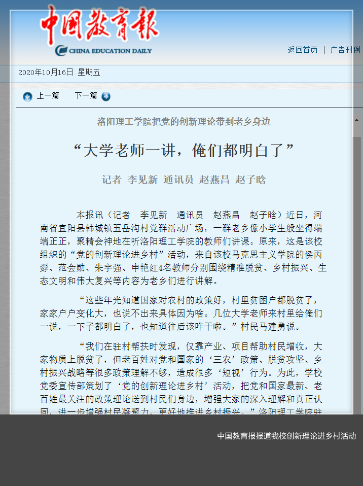 2020年10月16日,中国教育报以《‘大学老师讲一讲,俺们都明白了’》报道了美高梅娱乐场