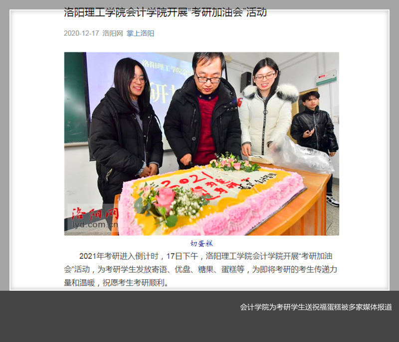 开展“考研加油会”活动,定制专门祝福蛋糕,上写“一‘研’为定”寓意2021“定为研一”,老师们还准备了节目、组织大家玩游戏,发放糖果、优盘等礼物为考研学生放松解压。此次活动得到多家媒体报道,还登上当日微博热搜。