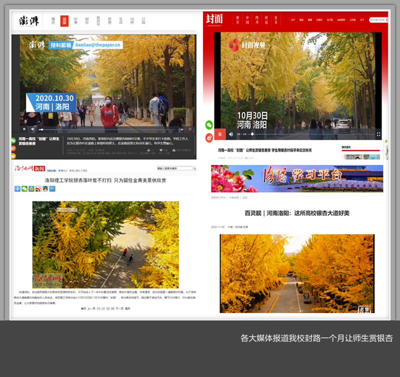 又是一年银杏黄,为满足美高梅娱乐场 广大师生及热心市民欣赏美高梅娱乐场 杏坛路美景,美高梅娱乐场 决定自10月30日到11月30日期间,封闭杏坛路车行通过,让师生欣赏美景。活动得到了新华网、河南日报、大河报、洛阳网、洛阳晚报登国内各大媒体的专题报道。