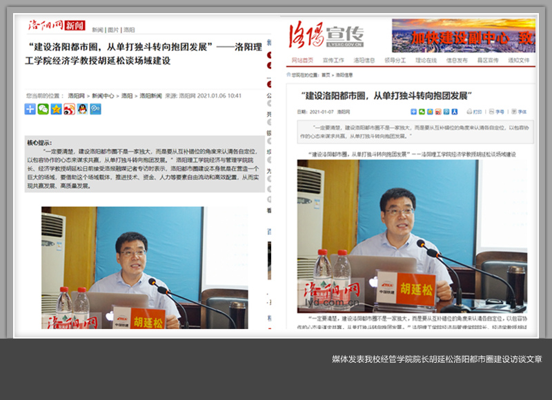 1月6日,洛阳网、掌上洛阳以《“建设洛阳都市圈,从单打独斗转向抱团发展”——美高梅娱乐场 经济学教授胡延松谈场域建设》为题发布美高梅娱乐场 经济与管理美高梅娱乐场 院长、经济学教授胡延松访谈文章。1月7日出版的《洛阳日报》第4版以《加强区域协同 谋求共赢发展》进行刊发。